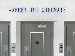 Gérald Minkoff, adepte des jeux de langage, était un « palindromographe » qui investissait tous les supports pour y inscrire ses énoncés réversibles – « plus court chemin pour aller d’où l’on vient ». Il utilisait plus particulièrement des carreaux de faïence émaillée, tels ceux qui surmontent depuis 1997 les ascenseurs du 4e étage du musée : AMEN ! ICI CINEMA !, anagramme du titre Anemic Cinema du film expérimental de Marcel Duchamp (1926). Dans une publication de 1997 consacrée à ses formules palindromatiques, Minkoff écrivait à leur propos, non sans humour : « Un palindrome remonte le temps à la même vitesse qu’il le descend. » La proximité des ascenseurs s’imposait donc.
