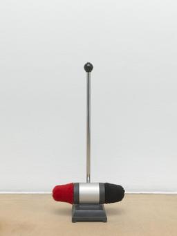 of the first section of the exhibition came parallel worlds and therapeutic travel. On every floor, Mondrian, Fontana, César, Buren, Vasarely, Andre were recycled and customized: one with faux fur, another with nail polish. Stepping from one floor to the next, visitors passed race cars smashed by She Devils on Wheels and lipstick-colored rockets, optical illusion wall paintings, and toys for huge dogs, nice friendly monsters dozing in the stifling air of hallucinogenic fumes. The exhibition followed a 1980s display strategy that created a blur of ideas and aesthetics, a space where fashion, advertising, design, and art all meld. The stairway served as the nerve center for the exhibition, as in a department store. The randomness of the spaces was tempered by the seriousness and