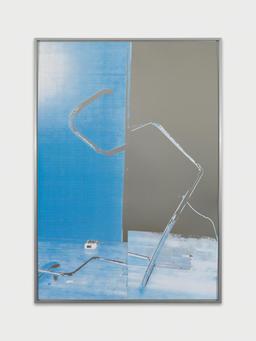 Repeated under different electronic formats, these signs—may they be Xs, Us, or even the image of a flame scanned from a book—have all become contemporary art icons. Though Guyton also produces sculptures, drawings, and installations, he chose this time to limit himself to the “painting” format. He is taking on a new chapter in his work with a series of clearly figurative pieces, alongside more abstract works, all created between 2015 and 2016. The central image of the exhibition, spanning various dimensions, is a photograph taken in his studio. In the foreground lying on the floor is one of his sculptures, a modified tubular framework from a Marcel Breuer chair. In the background, we make out the right side of one of his “Black paintings,” as well as the white wall on which it is resting. The series was completed with representations of the wooden floor in his New York studio, as well as close-ups of bitmap files.