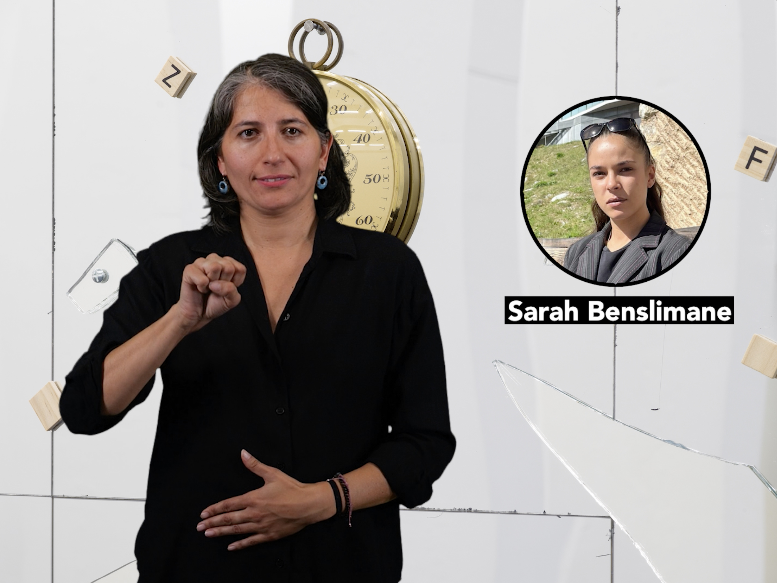 Guided tour of the Sarah Benslimane exhibition in French Sign Language (LSF), led by Noha El Sadawy, a deaf cultural mediator.