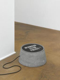 L’agence INFORMATION FICTION PUBLICITÉ est fondée en 1984 par Jean-François Brun, Dominique Pasqualini et Philippe Thomas (qui la quitte en 1985). La rétrospective occupant tout le deuxième étage était la première consacrée à cette entreprise qui, jusqu’en 1994, s’attachait à déjouer la subordination d’une œuvre à la signature d’un individu. IFP est ainsi une personne morale et un logo qui dissolvent l’identité des personnes – ses dirigeants – qui les font vivre ; on peut même parler ici de marque. Trois formes récurrentes jalonnaient l’exposition : le ciel bleu parcouru de nuages, d’abord, sorte de sigle visuel complémentaire du logo IFP, et qui serait une manière de publicité impossible pour le ciel ; le plot, ensuite, objet circulaire en ciment où sont inscrits le nom et le sigle de l’agence ; enfin, les strapontins