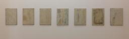 Fünf Nesselüberklebte Holzplatten. Unmassformen s’accroche au mur selon une amplitude variable. Si elle participe encore du domaine pictural à cause de son rapport à la cimaise, cette œuvre traversée par le vide en fait cependant le deuil au moins sur deux plans : celui de l’image, celui de l’intégralité du tableau dont ne nous sont proposés que des manques ou des fragments, des restes. Ce deuil pictural est aussi graphique, la pratique du dessin étant fondatrice chez Walther : les trois rubans de tissu qui tombent du mur et qui constituent Drei Bänder (1963), sont des lignes en dehors de la page qui intègrent dans leur identité la conversion matérielle de l’artiste, fondamentale pour lui. Et qui, tout comme les cinq panneaux muraux, incarnent un proto minimalisme.