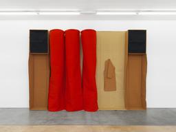 Fünf Nesselüberklebte Holzplatten. Unmassformen (1963), une œuvre murale en cinq parties, est contemporaine de la naissance du Werksatz (1963-1969), époque pendant laquelle Walther est encore étudiant à la Kunstakademie de Düsseldorf. On y retrouve un choix matériologique essentiel pour lui, celui du tissu qui recouvre les cinq panneaux et qui sera, dès 1963, la matière même de tous les objets de l’Ensemble d’œuvres no 1. Avec cette nouvelle matière pour le tableau et pour la sculpture, l’artiste fait un pas de côté par rapport à la matériologie classique qui implique aussi un changement de procédure : c’est la couture qui va désormais devenir sa technique exclusive de production.