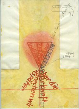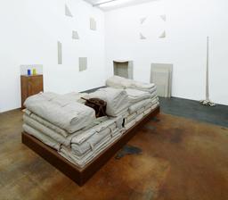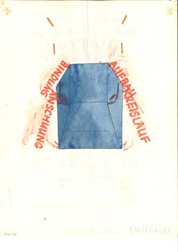 The Wortbilder is a series of 64 drawings made by Franz Erhard Walther (1939, Germany) while he was attending the Städelschule [art academy] in Frankfurt in 1957–1958. The artist claims that he made this work to avoid having to take a calligraphy class. However, while these gouaches on board clearly show technical mastery of the graphic features, the inscriptions they bear suggest associations of ideas, and already hint at concerns with the foundations of his work as an artist. These early works on paper were presented on the fourth floor, as a complete set for the first time. They were set in a dialogue with three subsequent canvas sculptures that played on the interaction with the body and space. The exhibition aimed to explore not only the value of representation, but also the ability of a language, either verbal or corporeal, to construct space.