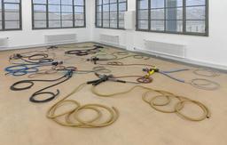 Long Distance Anger-Rubber Hose (1992) is composed of figurines arranged in a circle and tangled together in a controlled electrical network of plastic tubes. Metal crocodile clips are paired with rubber and plastic to embody a contained yet palpable fury.