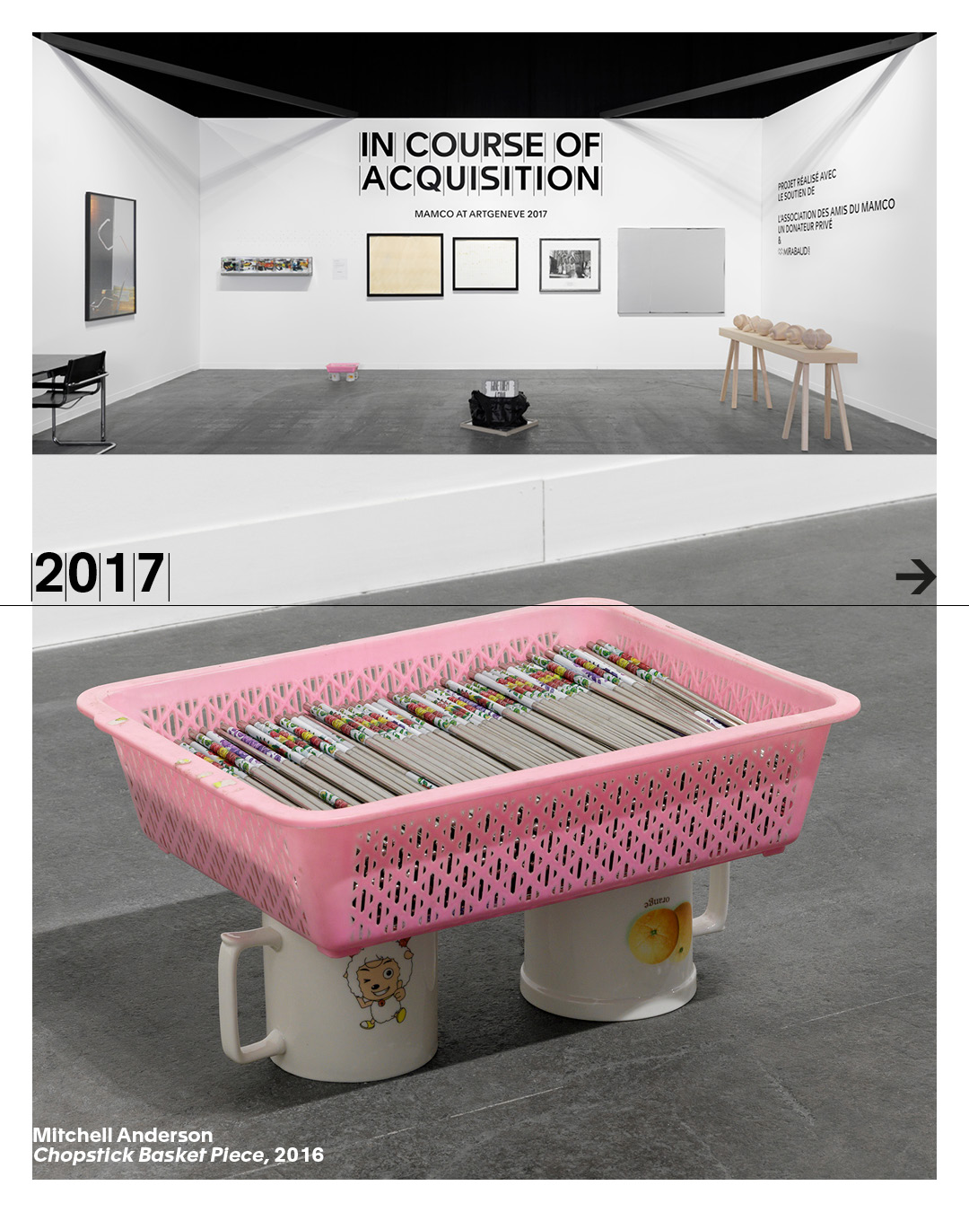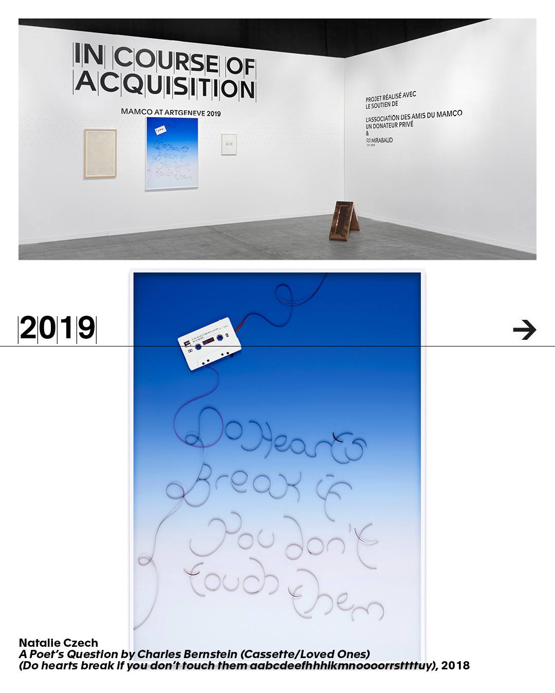 With In Course of Acquisition, MAMCO affirms its role within the art ecosystem and the local scene, acting as an active and specific partner for artists, galleries, collectors and the wider public. The project is made possible thanks to the support of Mirabaud & Cie, the Association des Amis du MAMCO, and an anonymous donor.