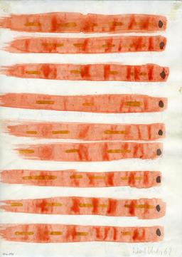 Fünf Nesselüberklebte Holzplatten. Unmassformen s’accroche au mur selon une amplitude variable. Si elle participe encore du domaine pictural à cause de son rapport à la cimaise, cette œuvre traversée par le vide en fait cependant le deuil au moins sur deux plans : celui de l’image, celui de l’intégralité du tableau dont ne nous sont proposés que des manques ou des fragments, des restes. Ce deuil pictural est aussi graphique, la pratique du dessin étant fondatrice chez Walther : les trois rubans de tissu qui tombent du mur et qui constituent Drei Bänder (1963), sont des lignes en dehors de la page qui intègrent dans leur identité la conversion matérielle de l’artiste, fondamentale pour lui. Et qui, tout comme les cinq panneaux muraux, incarnent un proto minimalisme.