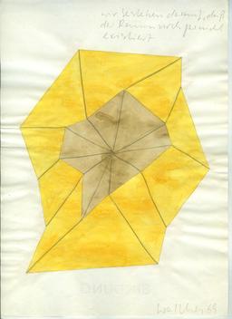 Fünf Nesselüberklebte Holzplatten. Unmassformen s’accroche au mur selon une amplitude variable. Si elle participe encore du domaine pictural à cause de son rapport à la cimaise, cette œuvre traversée par le vide en fait cependant le deuil au moins sur deux plans : celui de l’image, celui de l’intégralité du tableau dont ne nous sont proposés que des manques ou des fragments, des restes. Ce deuil pictural est aussi graphique, la pratique du dessin étant fondatrice chez Walther : les trois rubans de tissu qui tombent du mur et qui constituent Drei Bänder (1963), sont des lignes en dehors de la page qui intègrent dans leur identité la conversion matérielle de l’artiste, fondamentale pour lui. Et qui, tout comme les cinq panneaux muraux, incarnent un proto minimalisme.