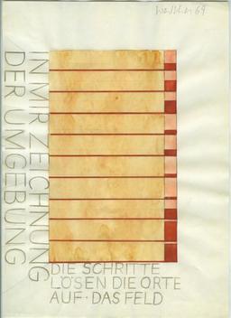 Fünf Nesselüberklebte Holzplatten. Unmassformen s’accroche au mur selon une amplitude variable. Si elle participe encore du domaine pictural à cause de son rapport à la cimaise, cette œuvre traversée par le vide en fait cependant le deuil au moins sur deux plans : celui de l’image, celui de l’intégralité du tableau dont ne nous sont proposés que des manques ou des fragments, des restes. Ce deuil pictural est aussi graphique, la pratique du dessin étant fondatrice chez Walther : les trois rubans de tissu qui tombent du mur et qui constituent Drei Bänder (1963), sont des lignes en dehors de la page qui intègrent dans leur identité la conversion matérielle de l’artiste, fondamentale pour lui. Et qui, tout comme les cinq panneaux muraux, incarnent un proto minimalisme.