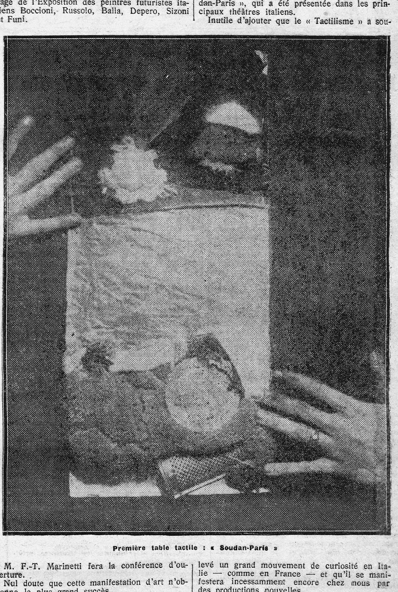 Le 20 janvier 1921, Filippo Tommaso Marinetti, le père du Futurisme, donne une conférence à Genève, dans le cadre de l’Exposition Internationale d’Art Moderne qui se tient alors au Palais électoral. La conférence porte sur le « Tactilisme », une nouvelle forme d’art « qui se propose de donner au tact humain des plaisirs de suggestion artistique aussi variés que ceux que nous éprouvons à l’aide des yeux et des oreilles ». Pour appuyer sa démonstration, Marinetti fait circuler dans le public sa première « table tactile » réalisée par sa compagne, l’artiste Benedetta Cappa. Intitulée Soudan-Paris, cette planche de quelques décimètres carrés condense les sensations tactiles d’un voyage imaginaire que Marinetti décrit ainsi : « Soudan-Paris contient dans sa partie Soudan des valeurs tactiles rudes, grasses, raboteuses, piquantes, brulantes (étoffe spongieuse, éponge, papier de verre, lin, brosse de fer) ; dans sa partie Mer des valeurs tactiles glissantes, métalliques, fraîches (papier d’étain) ; dans sa partie Paris des valeurs tactiles moelleuses, très délicates, caressantes, chaudes et froides à la fois (soie, velours, plumes, houppes) ».