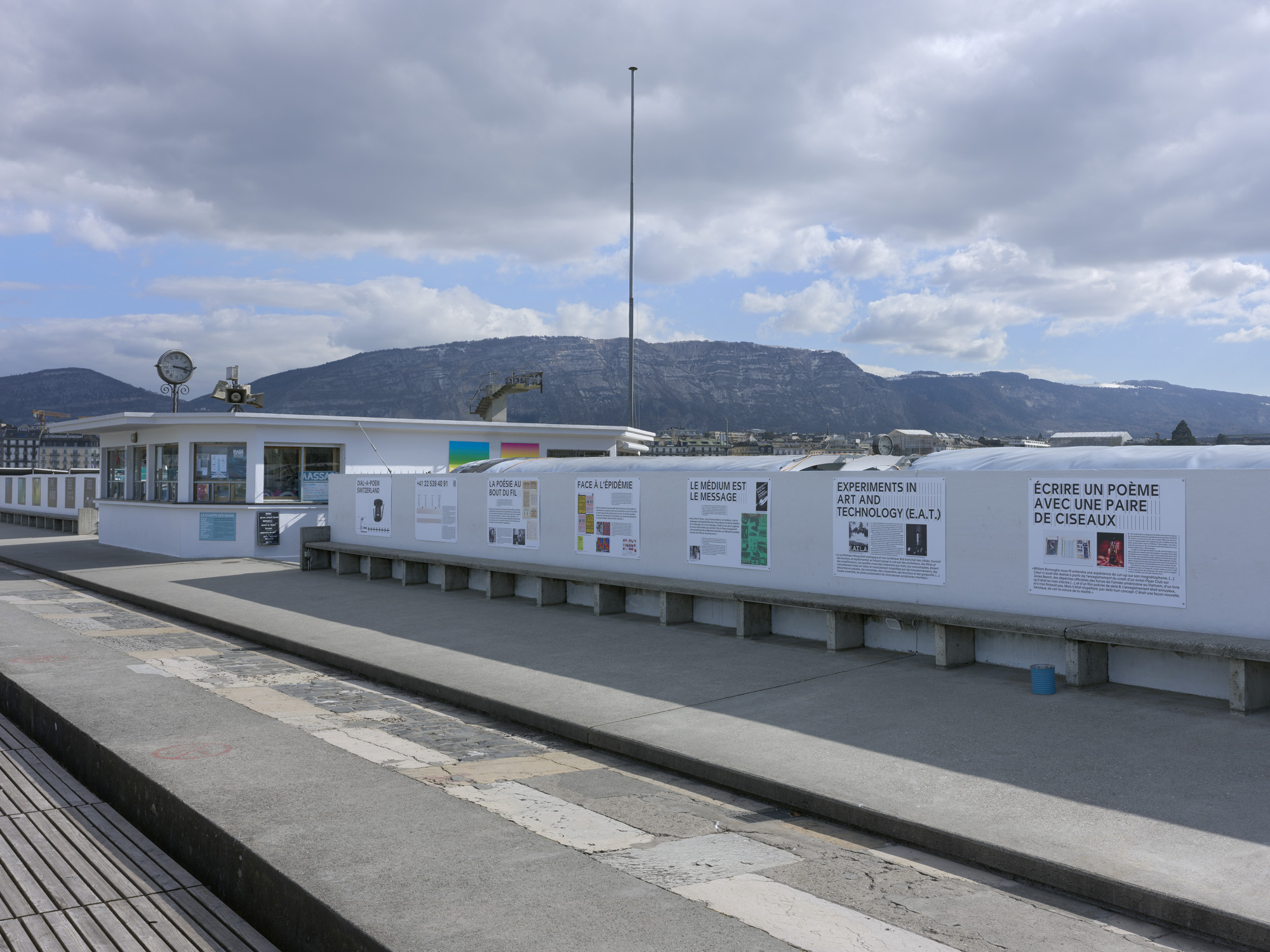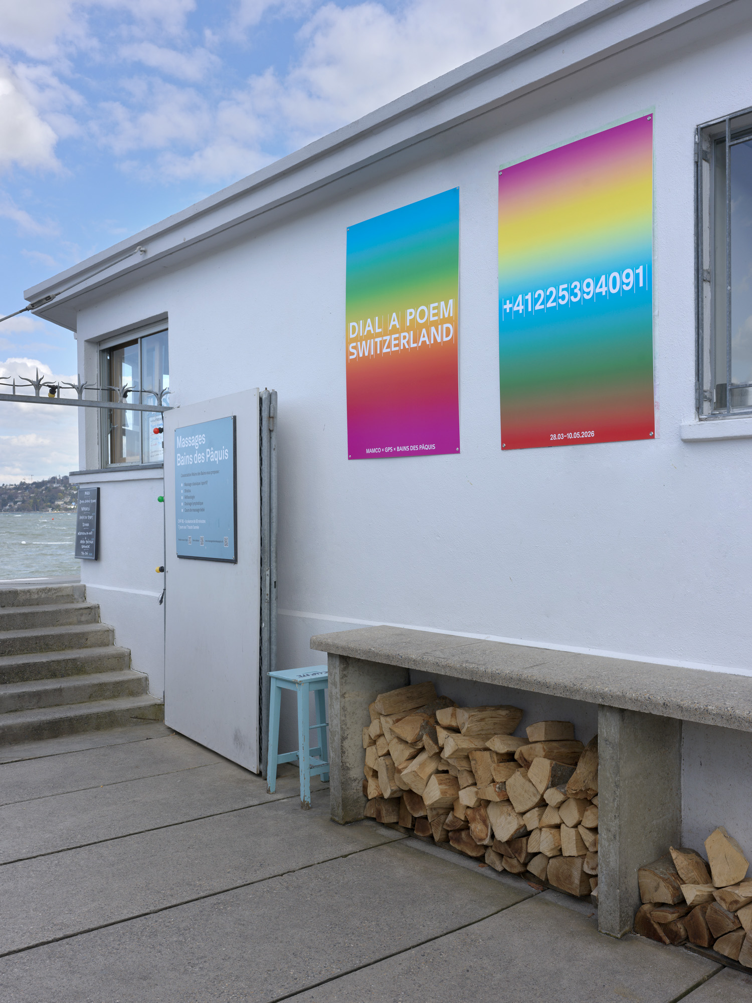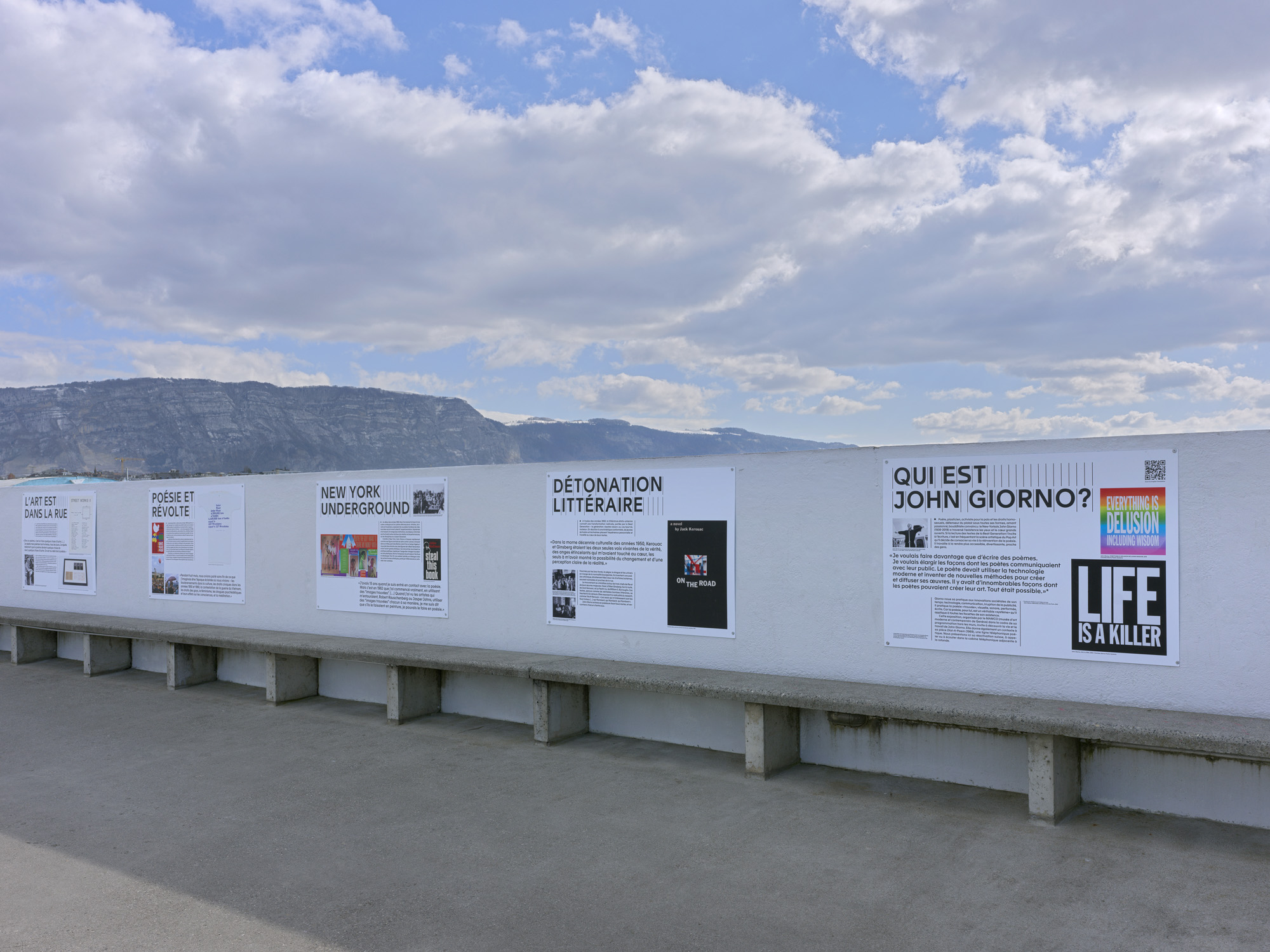 C’est aux Bains des Pâquis, en plein air, qu’a lieu le lancement de ce projet : un téléphone est installé dans une ancienne cabine téléphonique. Le long de la jetée se déploie en parallèle une exposition autour de John Giorno. Elle évoque les courants littéraires et artistiques qui ont traversé sa carrière : « Beat Generation », poésie visuelle, scène underground, Pop Art ou encore expérimentation technologique de la scène artistique new-yorkaise. L’un des lieux les plus populaires de Genève devient ainsi la scène de ces littératures d’hier et d’aujourd’hui, et offre autant de cadeaux à celles et ceux qui décrocheront le téléphone ou appelleront le numéro de Dial-A-Poem Switzerland.